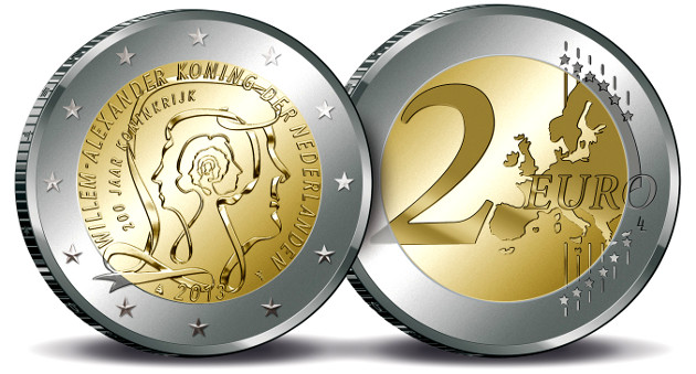 Desde primera hora de la mañana, la ceca holandesa KNM ha presentado y puesto a la venta, su segunda moneda de 2 euros conmemorativa de este año 2013, dedicada a los «200 Años del Reino de Holanda», en la que aparece el perfil del rey Guillermo Alejandro, y siguiendo la cinta que forma este dibujo, encontraremos la efigie de los siete príncipes de los Países Bajos, dando forma a una moneda realmente original.