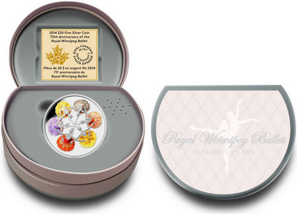 La moneda en cuestión, acuñada en plata y con un facial de 20 dólares canadienses está dedicada a conmemorar el 75 aniversario del Royal Winnipeg Ballet.