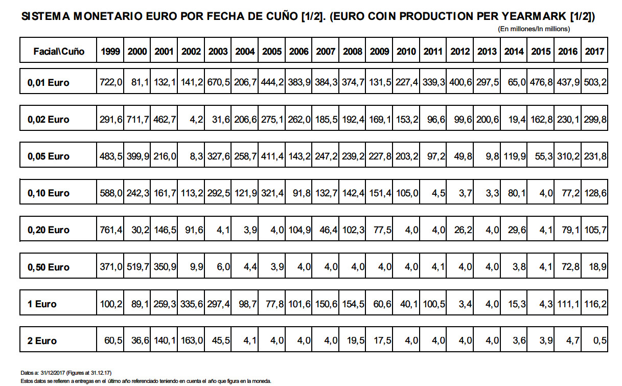 Producción de moneda Euro por fecha de cuño 1999 – 2017
