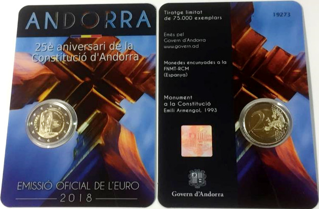 Seguro que todos conocéis el motivo de la primera moneda de 2 euros conmemorativa que Andorra emite en este 2018 dedicada al «25º Aniversario de la Constitución de Andorra», por cierto mañana martes 13 de marzo es el día en el que se pone a la venta de forma oficial las 75.000 piezas de las que consta la emisión.