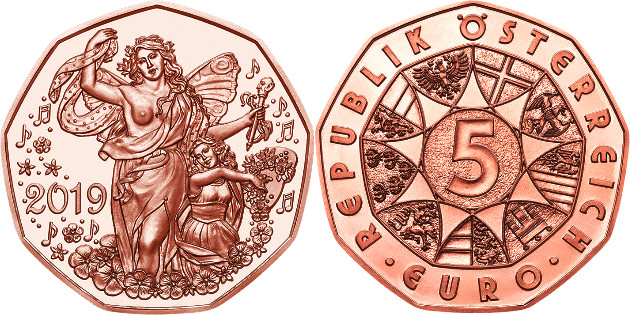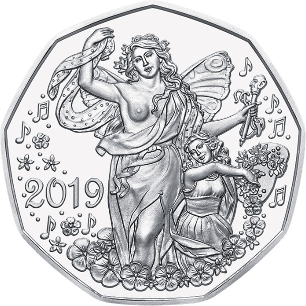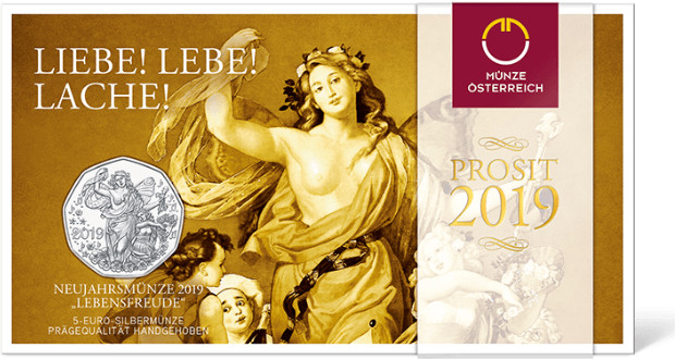 Celebrando el 150 aniversario de la Ópera Estatal de Viena, la Moneda de Año Nuevo 2019 se inspira en el concepto Alegría de Vivir, un cóctel embriagador de satisfacción, exuberancia y lujuria por la vida. Este concepto, que se traduce mejor usando el término francés joie de vivre, se simboliza en la moneda en forma de bailarina presente en un cuadro de Franz Dobiaschofsky (1818-1867), que se encuentra en la escalera principal de la mundialmente famosa casa de la ópera.