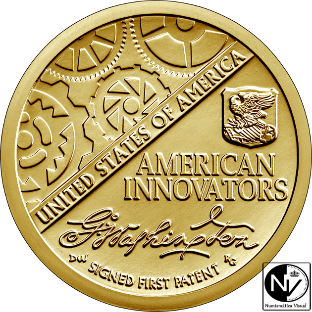 Las inscripciones que presenta, traducidas al español, son:»ESTADOS UNIDOS DE AMÉRICA», «INNOVADORES AMERICANOS» y «FIRMA DE LA PRIMERA PATENTE». El diseño muestra una composición estilizada de unos engranajes que representan la industria y la innovación. El año de acuñación, la marca de ceca y la inscripción «E PLURIBUS UNUM» se encuentran en el borde de la moneda.