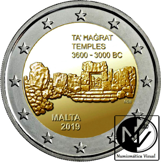 La moneda presenta en el centro de su anverso una imagen de los Templos Ta’ Ħaġrat. Por encima, en tres líneas horizontales, figura la leyenda “ TA’ ĦAGRAT TEMPLES 3.600 – 3.000 BC” (Before Christ), mientras que por debajo, en dos líneas horizontales, lo hacen la leyenda del país emisor “MALTA” y el año de emisión “2019”. Las iniciales “NGB” del grabador, Noel Galea Bason, aparecen a la derecha justo por debajo del motivo. Sobre el anillo exterior de la moneda figuran las 12 estrellas de la bandera de la UE.