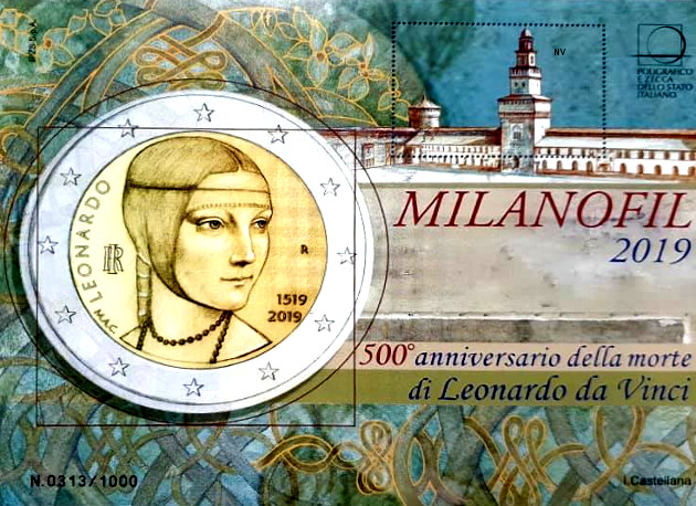 El próximo 17 de mayo se emiten 20.000 dípticos al precio de 18 euros que incluye la moneda de 2 euros conmemorativa en calidad Flor de Cuño, acompañada por la moneda de 1 euro regular italiana, el diseño de ésta reproduce el famoso «Hombre vitruviano» de Leonardo da Vinci, ilustrativo del ideal de proporciones del cuerpo humano, que está expuesto en la Galería de la Academia de Venecia.