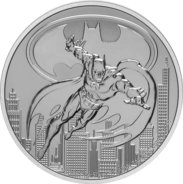 Como decia la primera está dedicada a Batman, donde se presenta una imagen con licencia oficial del superhéroe lanzándose al aire con su tradicional traje de murciélago sobre la ciudad de Gotham, con el logotipo de Batman representado en el cielo. El contenido en metal (1 onza de plata pura), la marca de copyright de Batman y los derechos de autor de DC Comics aparecen en el borde inferior como señales de autenticidad.