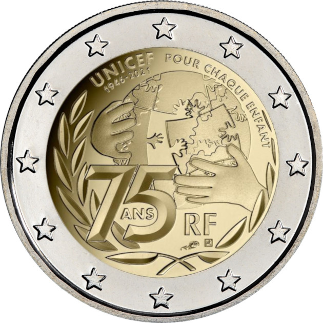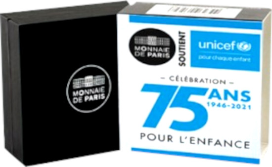 La moneda representa el planeta Tierra en forma de rompecabezas rodeado por dos manos de niños que nos recuerdan el compromiso de UNICEF con los niños de todo el mundo. Una rama de Laurel, un recordatorio del logotipo de UNICEF y símbolo de la paz, también está presente en el lado izquierdo. Finalmente, las fechas del 75 aniversario de la creación de UNICEF se muestran en la parte superior, seguidas por el lema «Pour chaque enfant» (Por todos los niños). La indicación del Estado emisor «RF» se encuentra en la parte inferior, debajo la marca de ceca y la del grabador, Joaquin Jimenez.