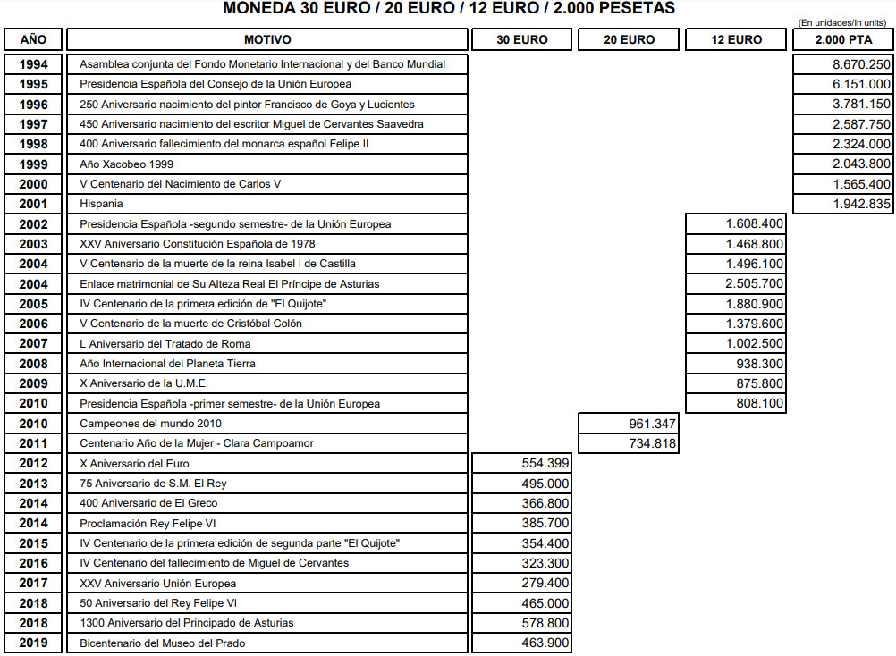 De la moneda de 30 euros 2019, Bicentenario del Museo del Prado, vemos un volumen de emisión de 463.900 piezas, digamos que en linea con los dos años anteriores.