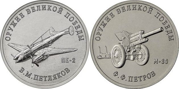 El reverso de las monedas quinta y sexta, están dedicadas a los diseñadores de armas Vladimir Petlyakov y el bombardero de buceo Pe-2, y Fyodor Petrov y el obús M-30. A lo largo de la circunferencia están las inscripciones ‘ОРУЖИЕ ВЕЛИКОЙ ПОБЕДЫ’ (ARMAS DE LA GRAN VICTORIA) en la parte superior y el nombre del diseñador del arma en la parte inferior.