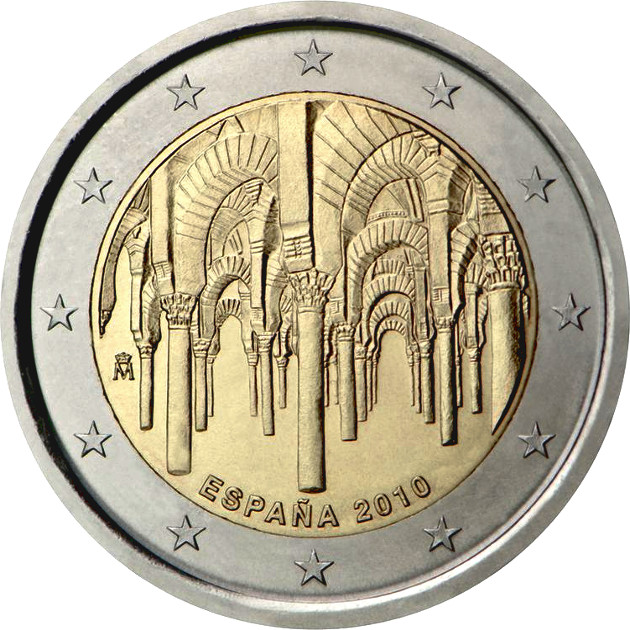 La moneda conmemora la inclusión en la lista del patrimonio mundial de la UNESCO del primer sitio español, el centro histórico de Córdoba, en 1984. En la moneda, obra del artista Alfonso Morales Muñoz, se representa el «bosque de columnas» de la Gran Mezquita Catedral de Córdoba, uno de los más antiguos y mejores ejemplos del arte islámico en Europa. La mezquita se construyó entre los siglos VIII y X, más tarde se consagró como catedral cristiana y fue sometida a sucesivas transformaciones. Debajo del motivo principal de la moneda, en sentido circular, aparece la palabra ESPAÑA (en letras mayúsculas) junto al año de acuñación, 2010, y, a la izquierda, figura la marca de ceca. En la corona circular figuran las doce estrellas de la Unión Europea.